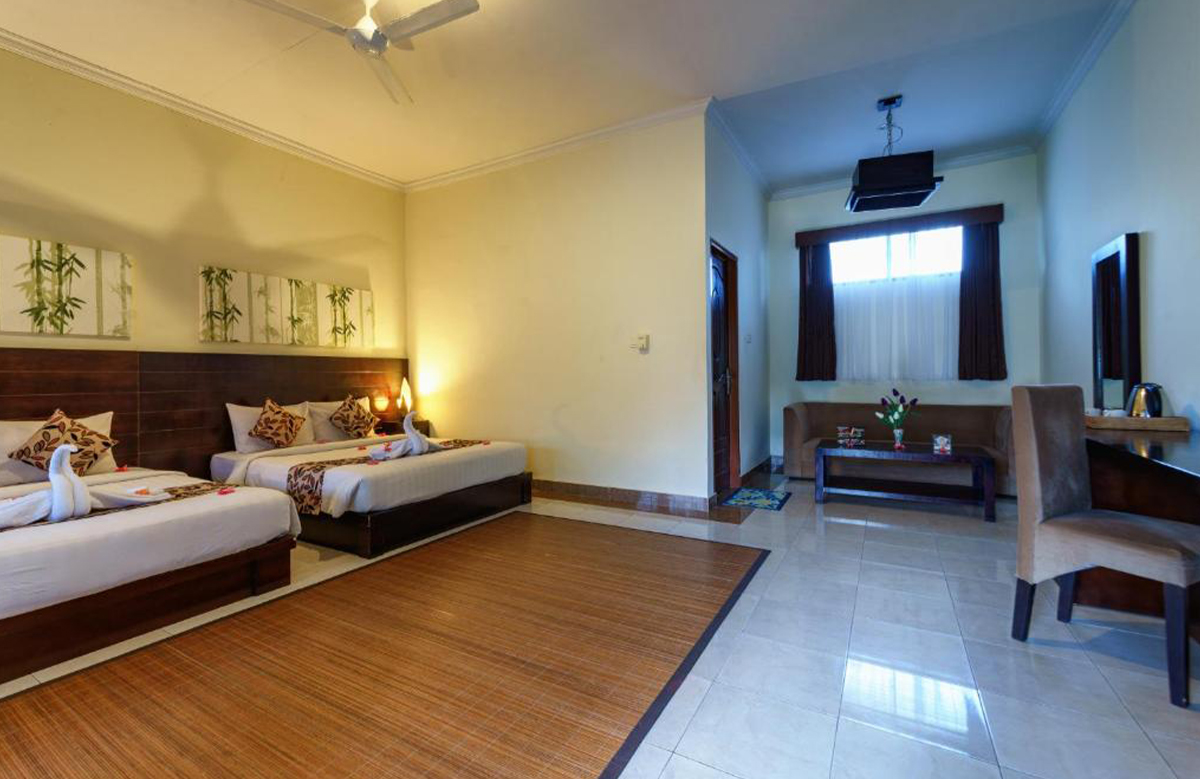 Kamar ini dipersiapkan khusus buat Anda yang berlibur ke Lombok bersama anggota keluarga. Memiliki 2 Tempat tidur yang lebih lebar, panjang dan nyaman untuk 2 orang dewasa dan 2 orang anak.
